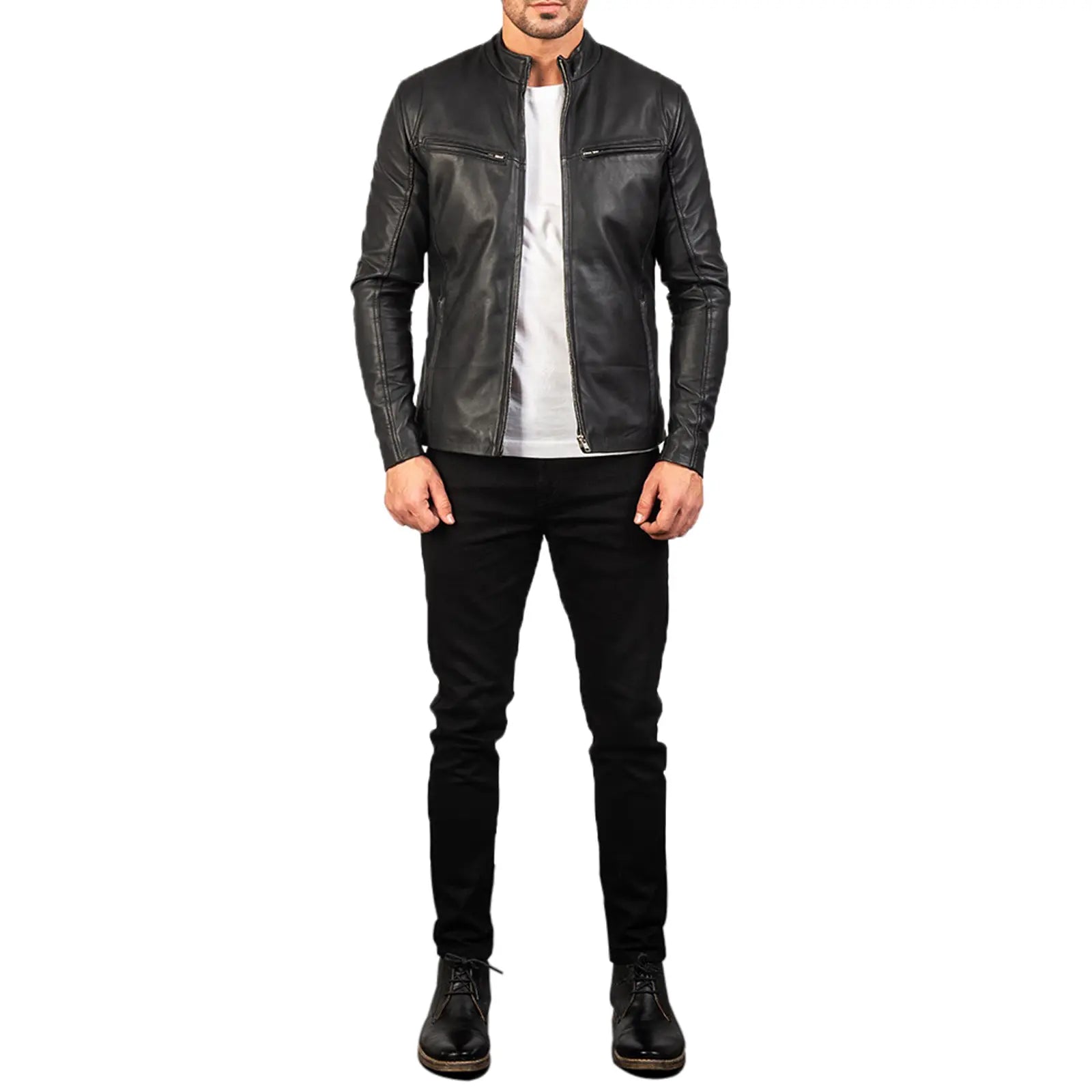 Upgrade your wardrobe with this Black Leather Jacket, crafted from genuine sheepskin leather for a sleek, durable look. The aniline leather finish enhances the jacket’s luxurious feel, while the quilted viscose lining ensures comfort and warmth. This jacket features a band collar for a modern, stylish appearance and zipper cuffs for a secure, adjustable fit.