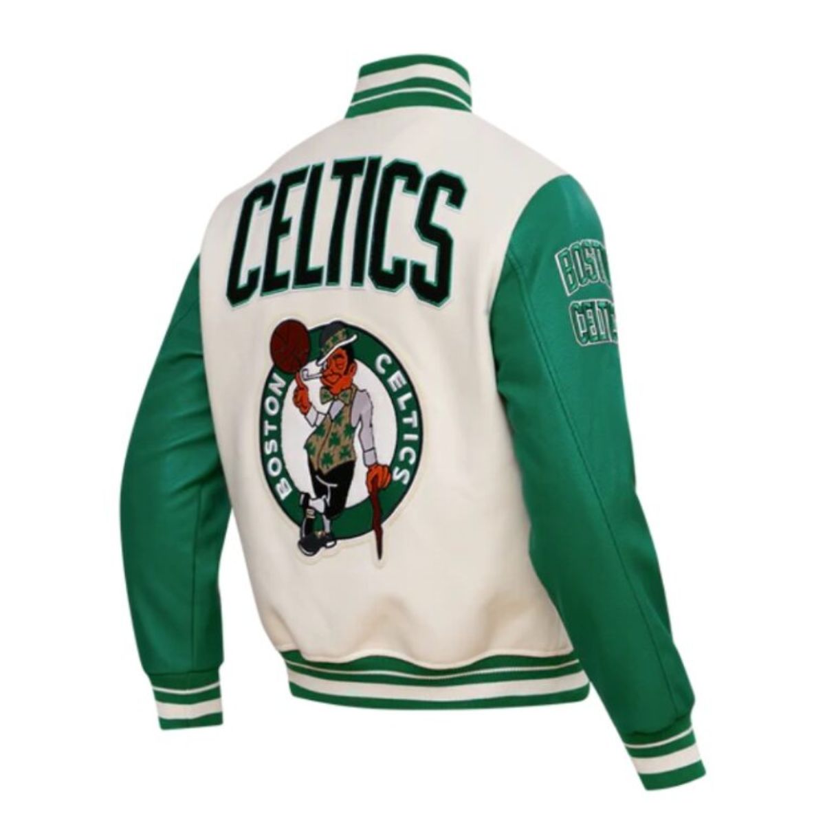 The Boston Celtics Retro Varsity Jacket is a timeless tribute to the iconic basketball team, combining vintage style with premium craftsmanship. Made from a blend of wool and leather, this jacket offers a durable and sophisticated look. The white and green color scheme exudes team pride, making it a must-have for Celtics fans.