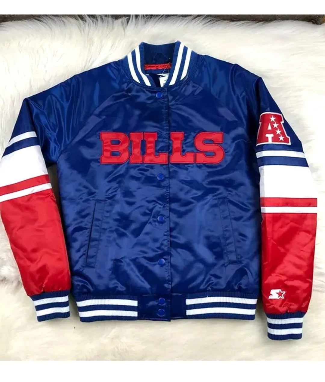 The Buffalo Bills Varsity Jacket is a stylish way to showcase your team pride while staying comfortable. Crafted from premium satin fabric, this jacket delivers a sleek and lightweight feel, perfect for game days or casual outings. The vibrant blue and red color scheme celebrates the team's iconic spirit, making it a standout piece in any wardrobe.