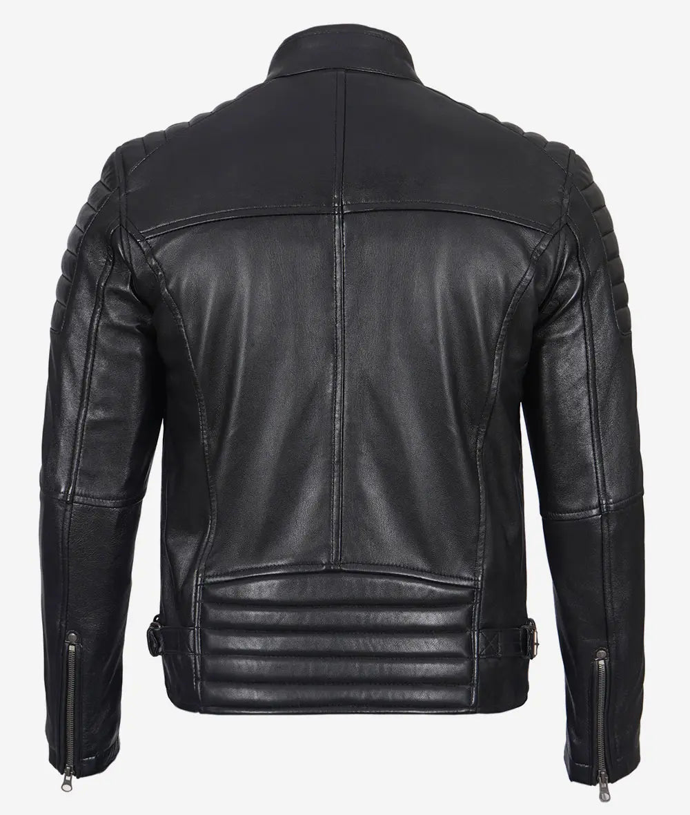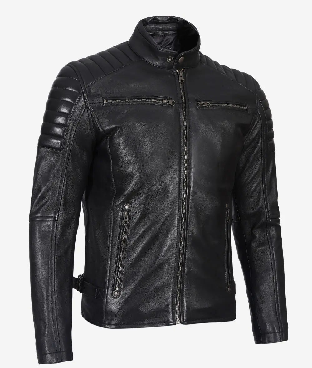 The Cafe Racer Leather Jacket with Padded Shoulders is the ultimate combination of rugged style and comfort. Crafted from premium real leather, this jacket features a sleek black finish and quilted viscose lining for added warmth and luxury. The padded shoulders add a touch of classic biker aesthetics while providing extra durability for adventurous rides. With a band collar secured by a snap button and a front zipper closure, this jacket delivers both style and practicality.
