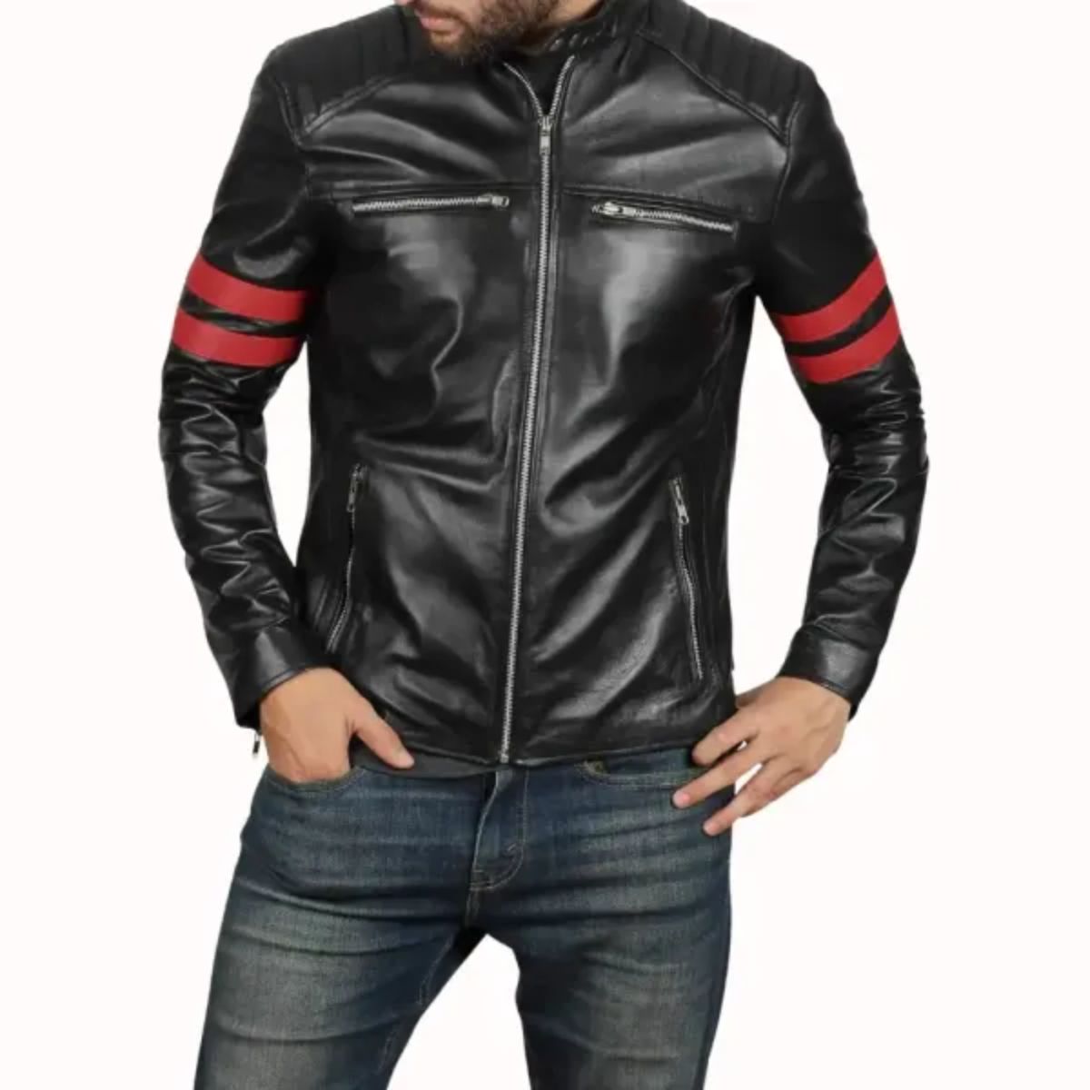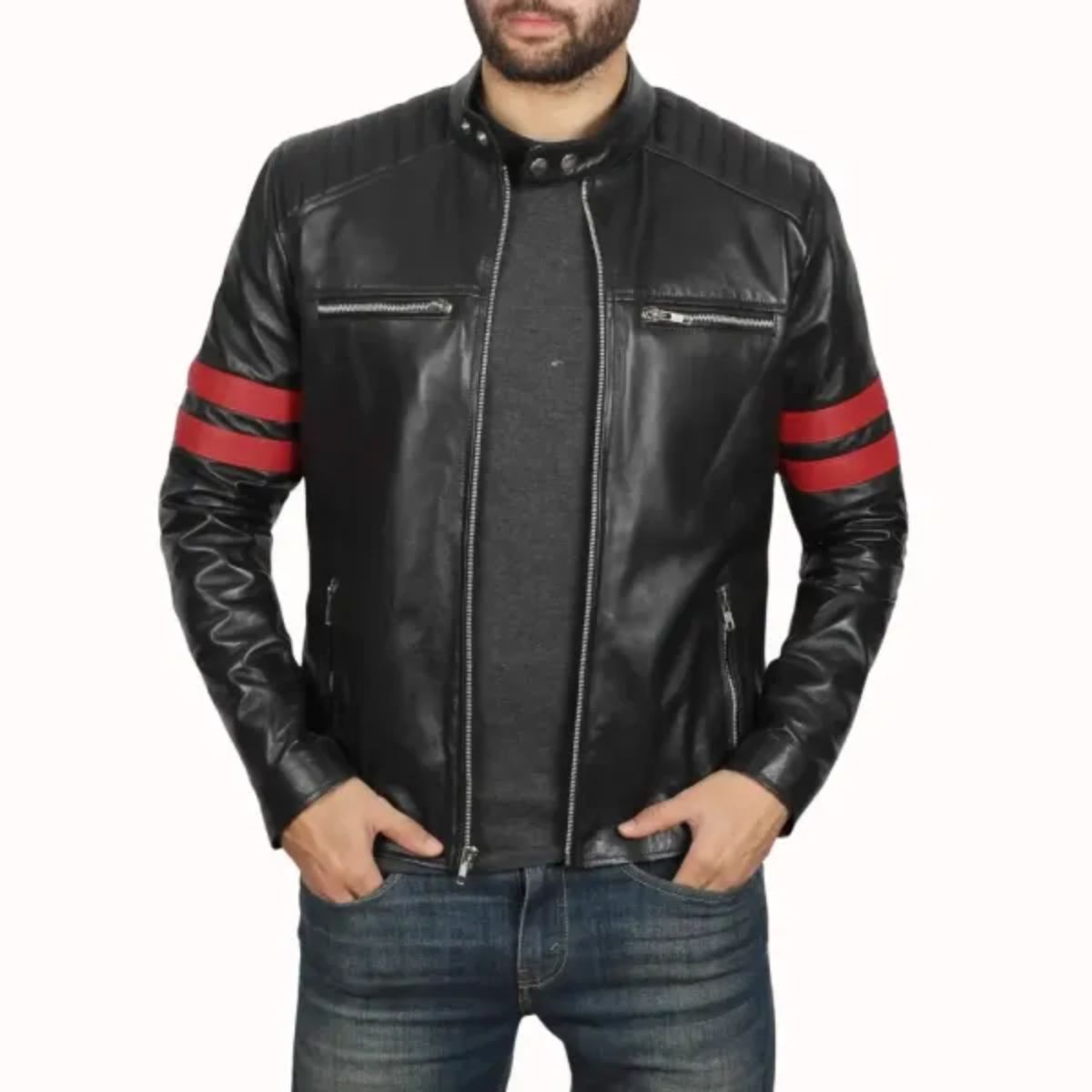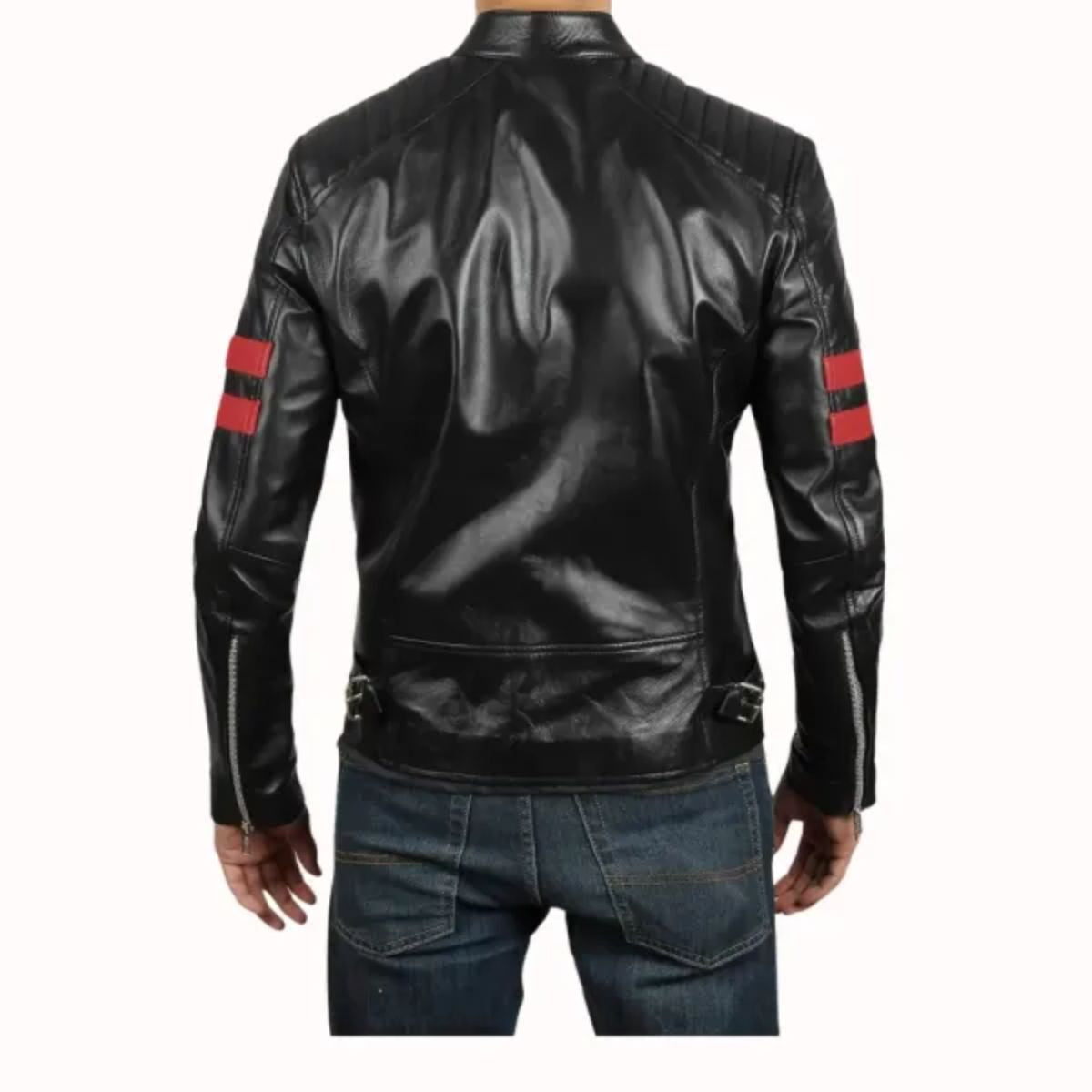 Make a bold statement with the Cafe Racer Leather Jacket with Red Stripes, crafted from real lambskin leather with a glossy soft finish. The black color provides a sleek, timeless look, while the red stripes on the sleeves add a sporty, modern touch. The soft polyester inner lining ensures comfort, making this jacket as practical as it is stylish.