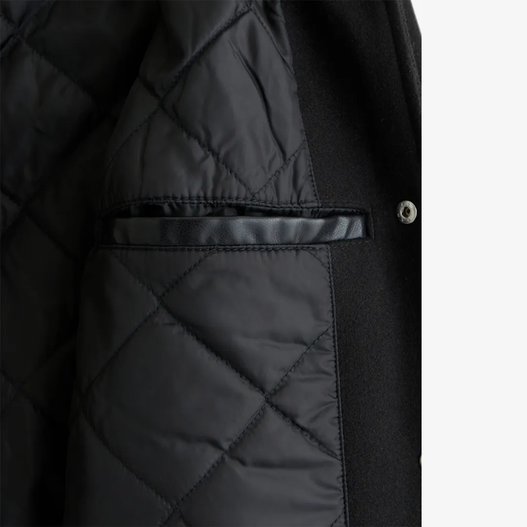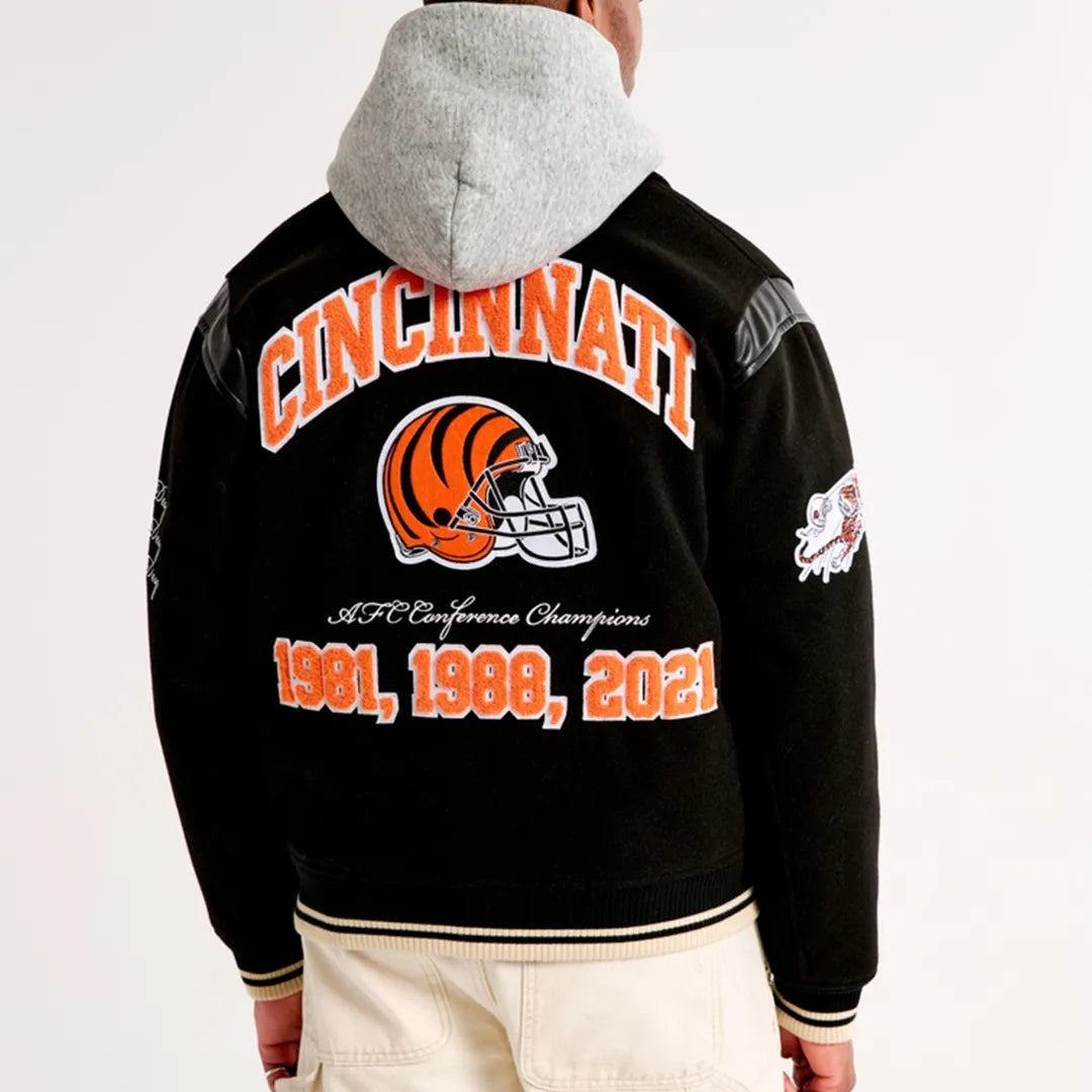 The Cincinnati Bengals Varsity Jacket is a timeless blend of classic varsity style and team spirit, perfect for fans of the iconic NFL team. Made with a premium wool body and genuine leather sleeves, this jacket combines durability with a sleek, polished finish. Its bold black color adds a versatile and modern touch, making it ideal for both game days and casual outings.