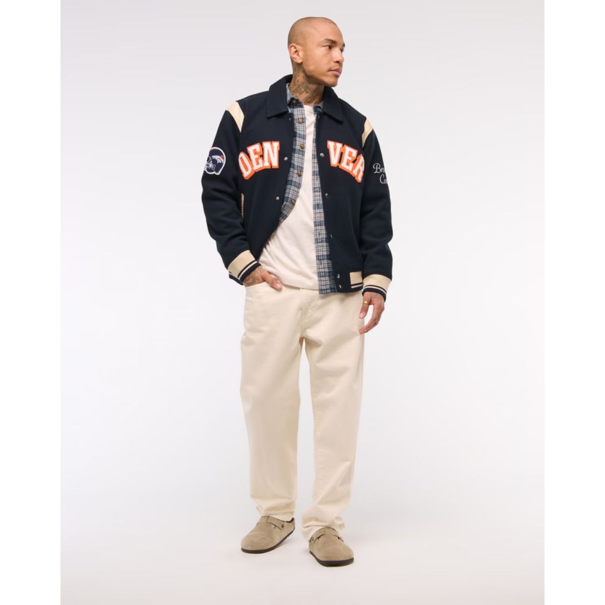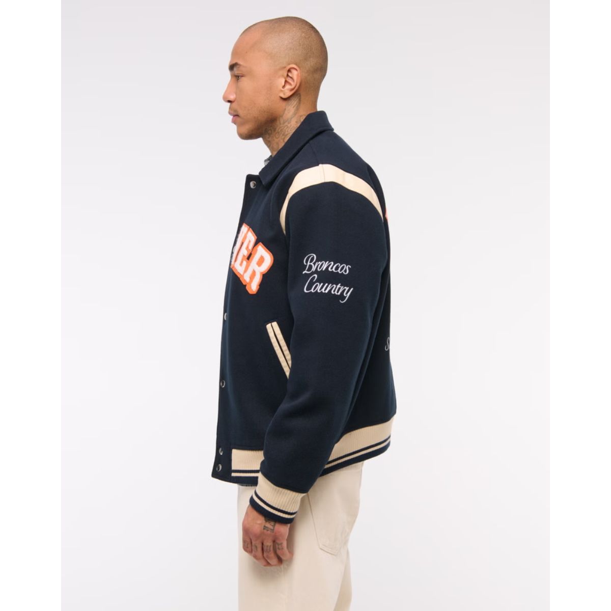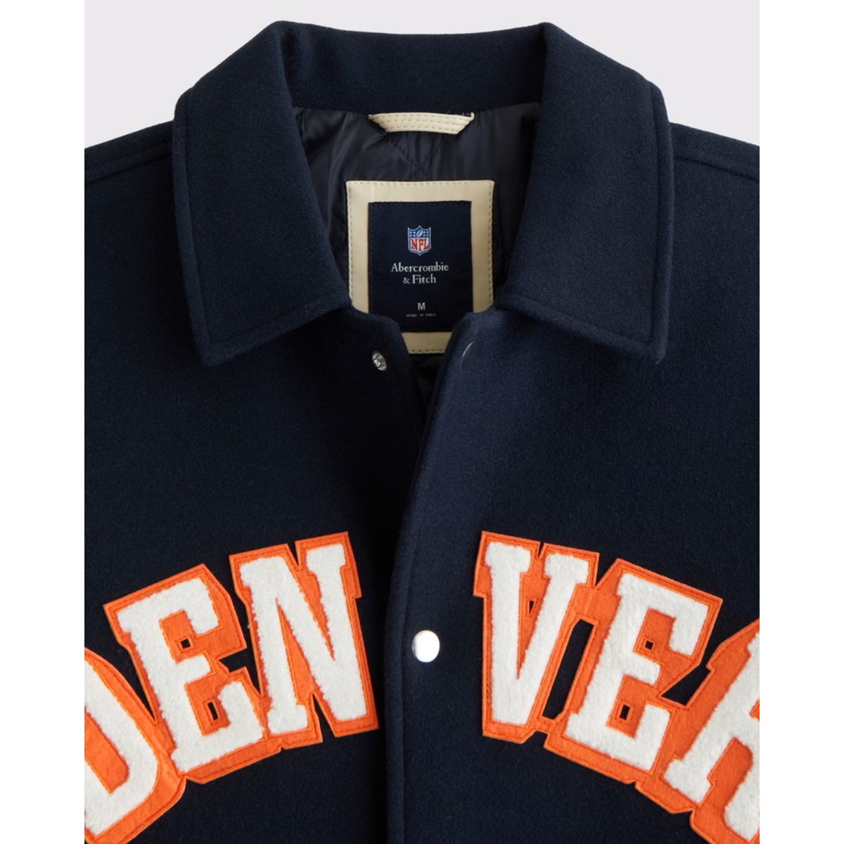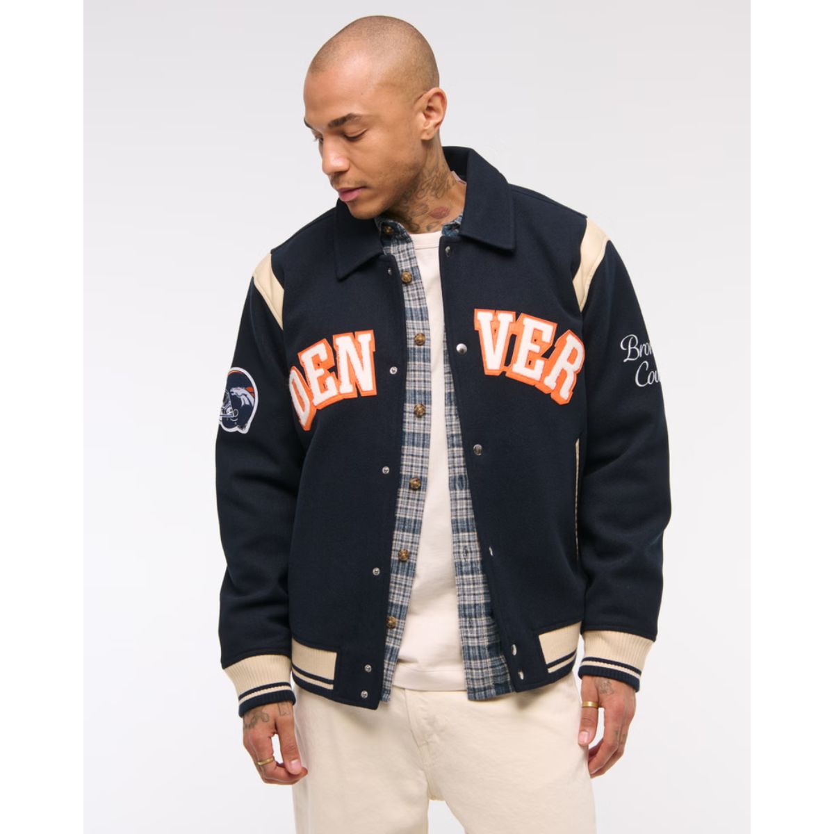 The Denver Broncos Varsity Jacket is a timeless piece that proudly showcases your support for the legendary football franchise. Designed for both men and women, this jacket is crafted from high-quality wool, ensuring warmth and durability. Its glorious navy-blue color highlights your team spirit while maintaining a sleek and stylish appearance.