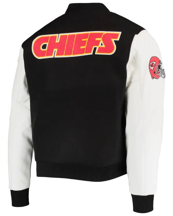 Show your team pride in style with the Kansas City Chiefs Black and White Varsity Jacket. Made from 100% real wool and genuine leather sleeves, this jacket offers a perfect blend of durability, warmth, and classic varsity aesthetics. The black and white color scheme delivers a bold and versatile look, making it ideal for fans and casual wearers alike.