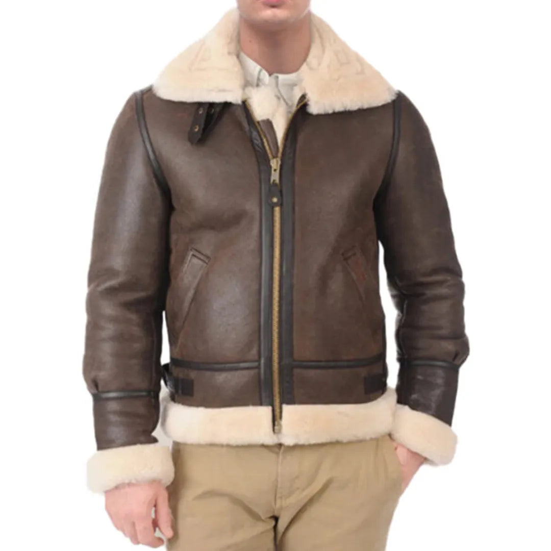 Step into classic style with the Men B3 Bomber Shearling Leather Jacket, designed for both warmth and rugged elegance. Made from genuine leather, this jacket offers durability and a sleek, timeless look. The shearling lining provides exceptional warmth, making it perfect for colder weather. The rich brown color exudes a rugged charm that complements the bomber style.